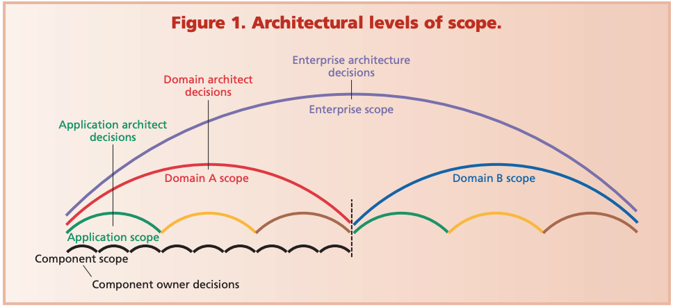 Architects work on different architectural levels of scopes in an organization. In the whitepaper' Architecture as Business Competency,' Ruth Malan and Dana Bredemeyer describe the relationship of an architect with a team flawlessly. "It cannot be up to developers and business analysts to decide what parts of the architecture to apply and what parts to ignore. If you treat your architects as consultants rather than decision-makers … all you can expect to get is an assemblage of parts with unpredictable properties." The parts of the architecture on different levels are not abstract from the other levels; they are different parts of the system. Teams can still make decisions on their scope, but not on the scope of another level.